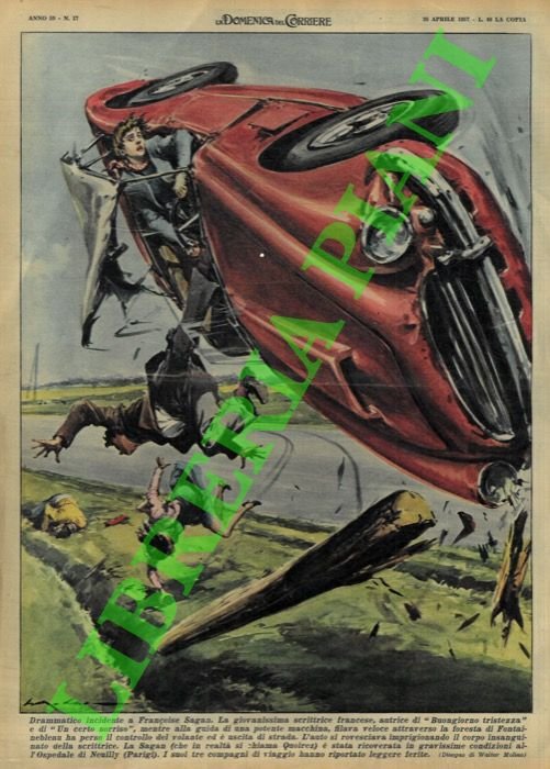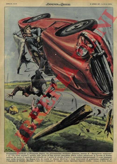 La scrittrice francese Sagan, alla guida di una potente macchina, perdeva il controllo del volante e usciva di strada.