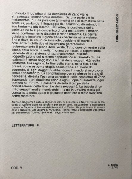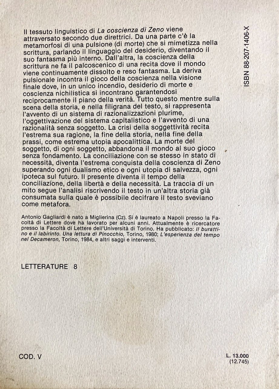 Soggetti: Studi letterari Critica letteraria Linguistica Filologia Lingua Letteratura italiana Romanzi biografici Novecento Analisi Psicologia Opere generali Malattia Tebe Peste Simbolismo Padre Morte Colono Suicidio Metafora Salvezza Salute Convinzione Smettere di Fumare Condizione umana Ingenuità Candido Candide Psicanalisi Italo Svevo Pulsioni Nichilismo Capitalismo Scrittura Fascismo Joyce Flusso di coscienza Basedow-Graves Biografie Dottor S. Sigmund Freud Edoardo Weiss Memorie Zeno Cosini Charles Baudouin Trieste Prefazione Libri rari fuori catalogo Saggistica Vizio Fumo Ultima sigaretta Nevrosi Colpa Matrimonio Complesso di Edipo Tradimenti Veronal Diario Terapia Guarigione Gabriella Contini Romanzo inevitabile Giuseppe Genco Giovanni Palmieri Schmitz Noemi Paolini Giachery Superuomo Eduardo Saccone Commento Giulio Savelli Ambiguità necessaria Fabio Vittorini Augusta Autobiografia Carla Confessione Copler Cura Desiderio Diegesi Dolore Donne Esorcismi Eugenio Montale Feticismo Funerale Genette Guido Inconscio Ironia Lapsus Lavagetto Lettore Marco Levi Bianchini Metadiegesi Moglie Narrativa Racconto Relazione Senilità Stekel Preambolo Fantasmi Literary studies Criticism Linguistics Philology Language Italian literature Biographical novels Twentieth century Analysis Psychology General works Illness Thebes Plague Symbolism Father Death Suicide Metaphor Salvation Health Conviction Quitting smoking Human condition Naivety Psychoanalysis Impulses Nihilism Capitalism Writing Fascism Stream of consciousness Biographies Memoirs Preface Rare books out of print Non-fiction Vice Last cigarette Neurosis Guilt Marriage Oedipus complex Betrayals Diary Therapy Healing Superman Commentary Ambiguity Autobiography Confession Cure Desire Diegesis Pain Women Exorcisms Fetishism Funeral Unconscious Irony Reader Metadiegesis Wife Fiction Story Relationship Senility Preamble Ghosts