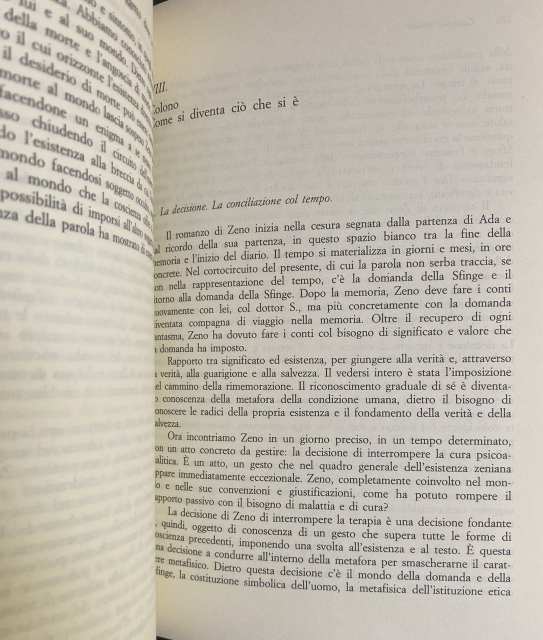Il tessuto linguistico di La coscienza di Zeno viene attraversato secondo due direttrici. Da una parte c’è la metamorfosi di una pulsione (di morte) che si mimetizza nella scrittura parlando il linguaggio del desiderio, diventando il suo fantasma più interno. Dall'altra, la coscienza della scrittura ne fa il palcoscenico di una recita dove il mondo viene continuamente dissolto e reso fantasma. La deriva pulsionale incontra il gioco della coscienza nella visione finale dove, in un unico incendio, desiderio di morte e coscienza nichilistica si incontrano garantendosi reciprocamente il piano della verità. Tutto questo mentre sulla scena della storia, e nella filigrana del testo, si rappresenta l’avvento di un sistema di razionalizzazioni plurime, l’oggettivazione del sistema capitalistico e l’avvento di una razionalità senza soggetto. La crisi della soggettività recita l’estrema sua ragione, la fine della storia, nella fine della prassi, come estrema utopia apocalittica. La morte del soggetto, di ogni soggetto abbandona il mondo al suo gioco senza fondamento. La conciliazione con se stesso in stato di necessità, diventa l’estrema conquista della coscienza di Zeno superando ogni dualismo etico e ogni utopia di salvezza, ogni ipoteca sul futuro. Il presente diventa il tempo della conciliazione, della libertà e della necessità. La traccia di un mito segue l’analisi riscrivendo il testo in un’altra storia già consumata sulla quale è possibile decifrare il testo sveviano come metafora.