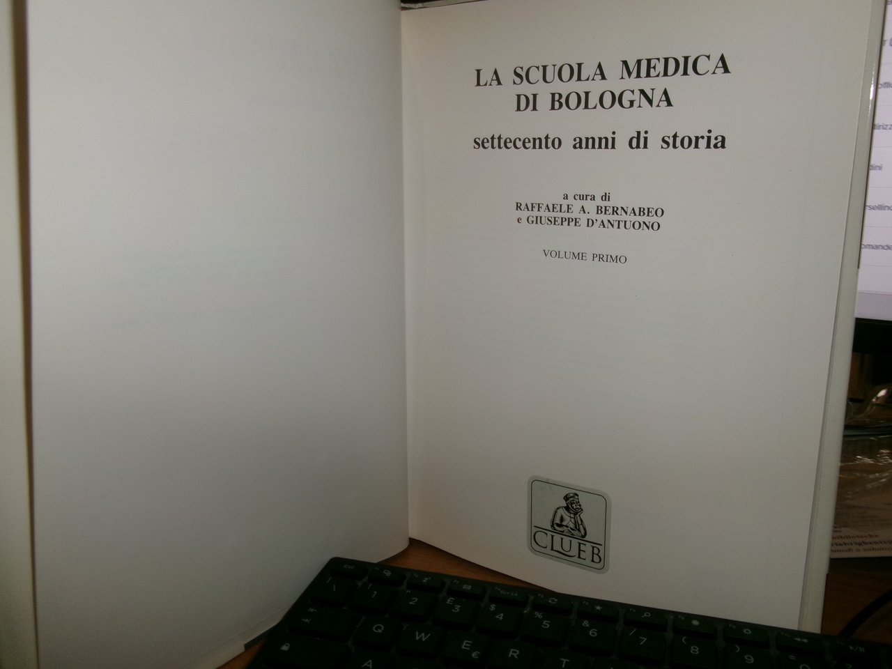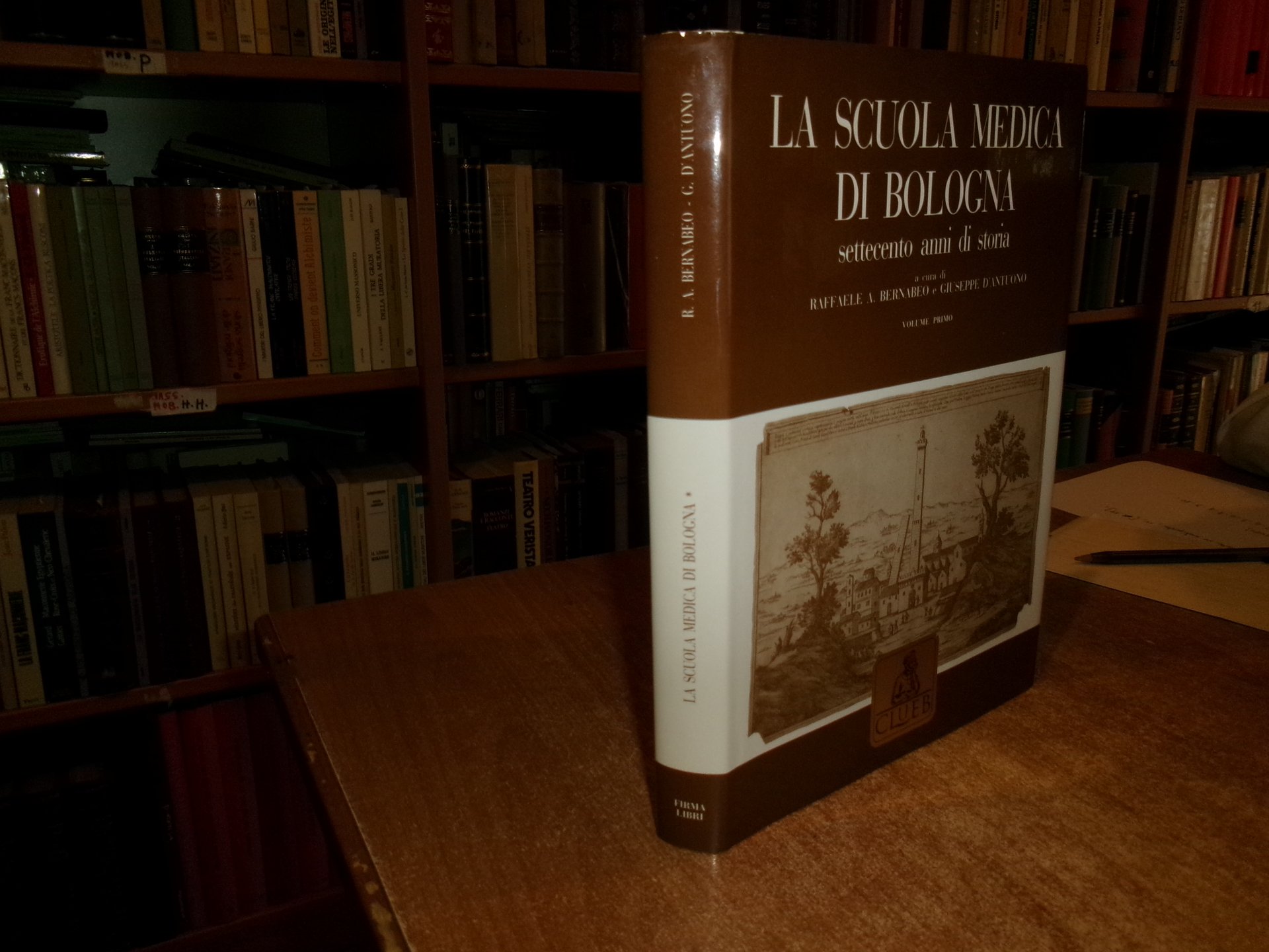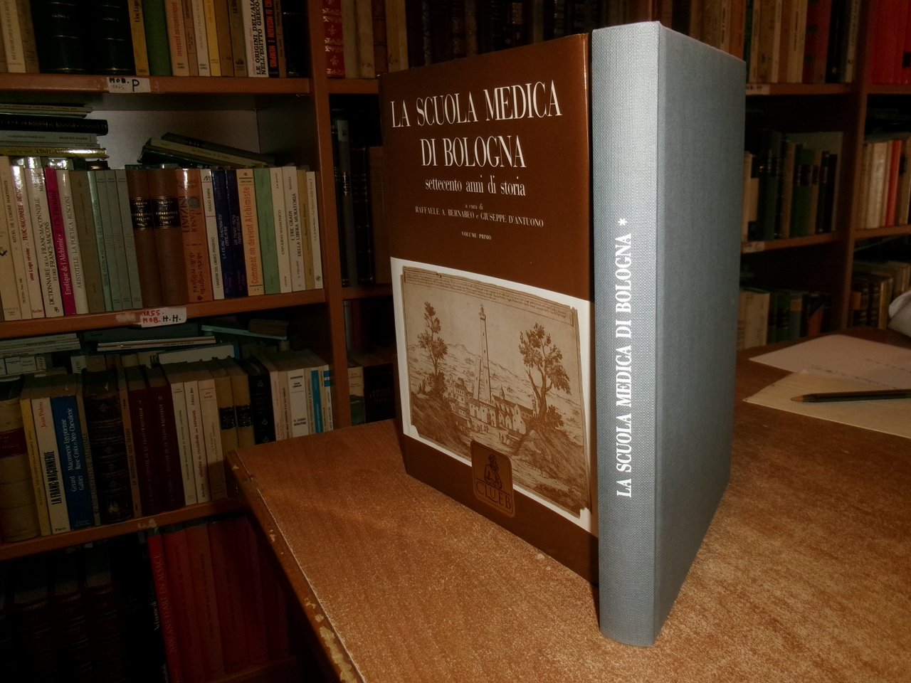 RAFFAELE BERNABEU/GIUSEPPE D' ANTUONO. Bologna, Clueb, 1988. LA SCUOLA MEDICA DI BOLOGNA settecento anni di storia. Volume Primo. In-8°, tela edit. con sovracopertina ill. a col. 261 pp. con XXXI tavole a colori e in bianco e nero f.t. Come nuovo del solo volume primo. Uff. C - III - 2 - 2