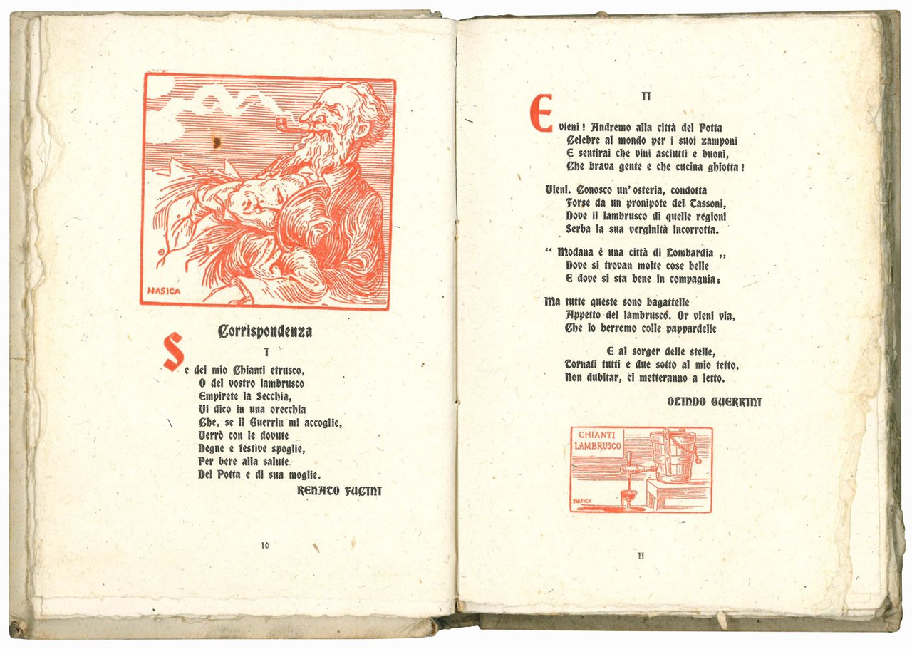 Mm. 174x122. Pp. VIII, 88, [2]. Stampa a due colori su carta a mano, illustrazioni e vignette in sanguigna di Silvestro Barberini, Alfredo Baruffi, Gaetano Bellei, Augusto Majani (Nasica) e molti altri. Parte letteraria curata da Olindo Guerrini e Alfredo Testoni. L'opera è stampata secondo il volere dell'editore con caratteri che richiamano quelli utilizzati per gli incunaboli e venne edita durante le Feste Tassoniane solenni che si tennero nel 1908 alla Fossalta. Cartonato editoriale con copertina illustrata realizzata da Barfredo da Bologna (pseudonimo di Alfredo Baruffi, 1876-1948), ripetuto al frontespizio con colori invertiti. Al frontespizio ogni copia presenta un timbro a secco di Formiggini. Ottimo esemplare (in barbe, lievissime mancanze alle cerniere).