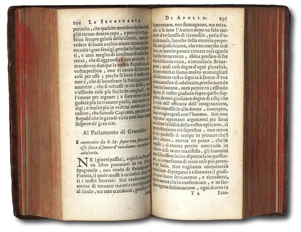 in-24, (120 x 60 mm), pp. 570, (6), legatura coeva pelle, dorso a nervi con titolo e fregi oro, tagli rossi. Antiporta allegorico figurato finememente inciso. Prima edizione di quest'opera di satira politico-letteraria, da taluni attribuita a Boccalini, il quale, dopo la pubblicazione dei suoi "Ragguagli di Parnaso" (Venezia, Farri, 1612) ebbe un gran numero di seguaci ed imitatori. Il Brunet (I, 1020), poi seguito dal Gamba, registra l'opera sotto Boccalini, ma afferma che "ce dernier n'en est cependant pas l'auteur" ed aggiunge che con la stessa data esistono tre diversi tipi di esemplari dell'edizione, il secondo dei quali corrisponde esattamente al nostro, che Melzi assegna a A. Santacroce. Buon esemplare. (con antiche scritte sul titolo). Melzi, Anonimi, III, 47. Gamba n. 1802, note. DBIt. II, 18 (su quest'opera registra un lavoro critico di U. Limentani).