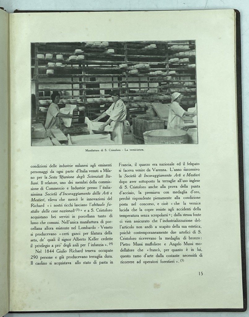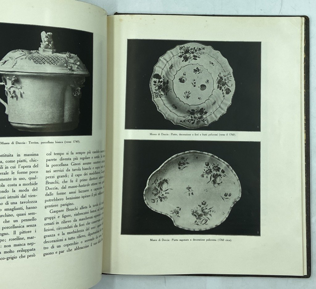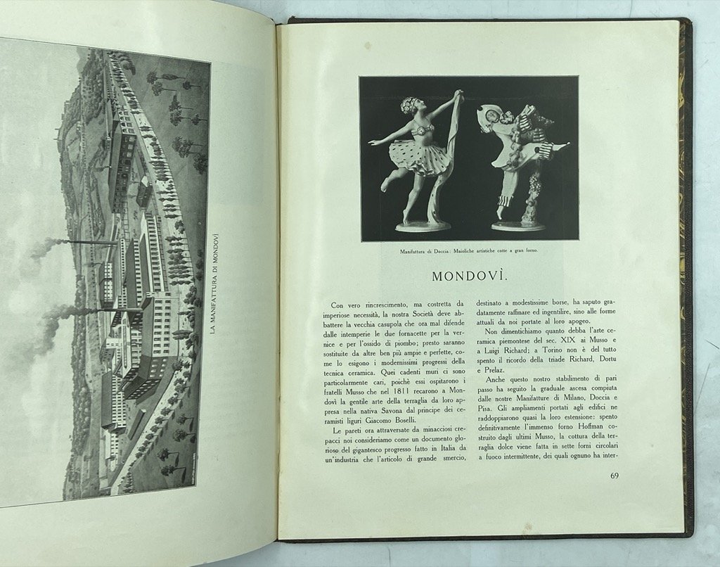 Legatura editoriale in piena pelle con fregi dorati sui piatti e sul dorso, in quarto cm 28.5 x 22.5, pp 79 (1) illustrate in nero. Buono stato, piccolo difetto sulla cuffia superiore, lievi fioriture. Monografia dedicata alla manifattura ceramica Richard Ginori e alla sua storia dal 1873 al 1923; il volume presenta le manifatture di S. Cristoforo (Milano), Pisa, Doccia, Rifredi e Mondovì con vedute degli stabilimenti e fotografie dei reparti e delle ceramiche prodotte, antiche e moderne. Esemplare della meno comune tiratura rilegata in pelle.