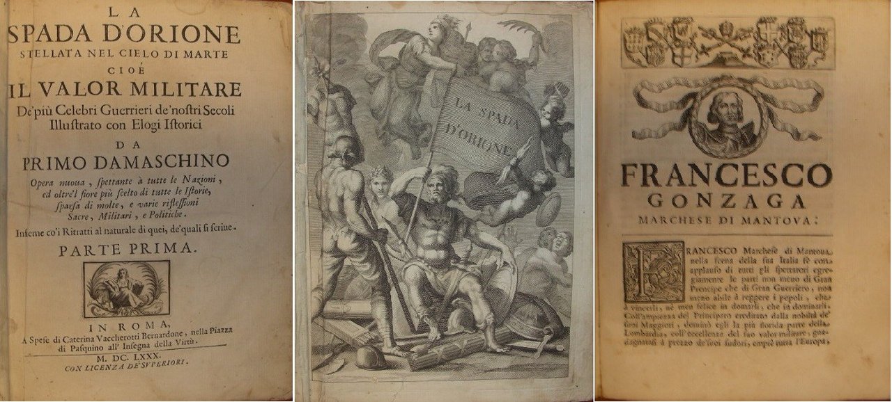LA SPADA D'ORIONE stellata nel cielo di Marte cioè il valor militare de' più celebri Guerrieri de' nostri Secoli Illustrato con Elogi Istorici da Primo Damaschino. Opera nuova, spettante à tutte le Nazioni, ed oltr'l fiore più scelto di tutte le Istorie, sparsa di molte, e varie riflessioni Sacre, Militari, e Politiche. Insieme co'i Ritratti al naturale di quei de' quali si scrive. Parte prima [tutto il pubblicato].