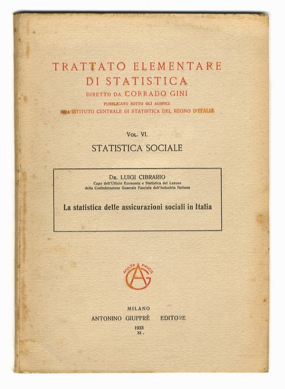Milano, Antonino Giuffrè - Editore, 1933, in-8, br. editoriale, pp. VIII, 61, [3]. Estratto dal volume intitolato "Statistica sociale" del "Trattato elementare di statistica diretto da Corrado Gini".