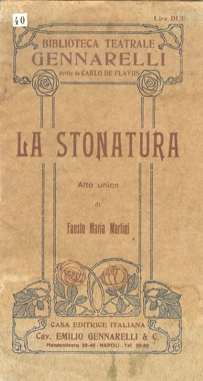 Napoli, Casa Editrice Italiana Cav. Emilio Gennarelli, 1921, in-8, br. editoriale (copertina anteriore decorata in stile Liberty), pp. 22, [2]. Con illustrazioni comprese nella paginazione. Biblioteca teatrale Gennarelli, diretta da Carlo de Flaviis.