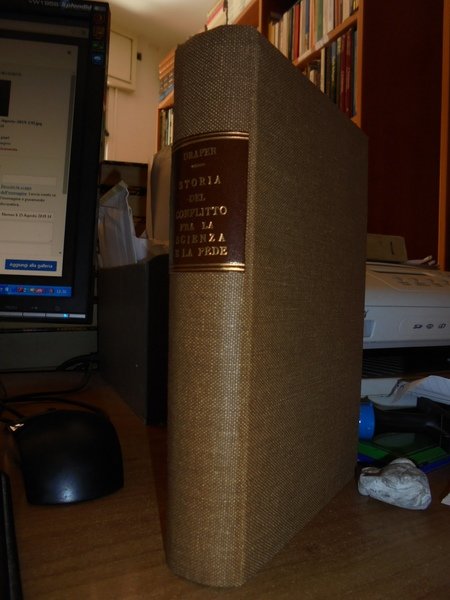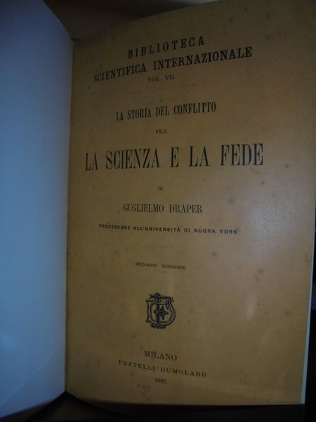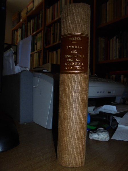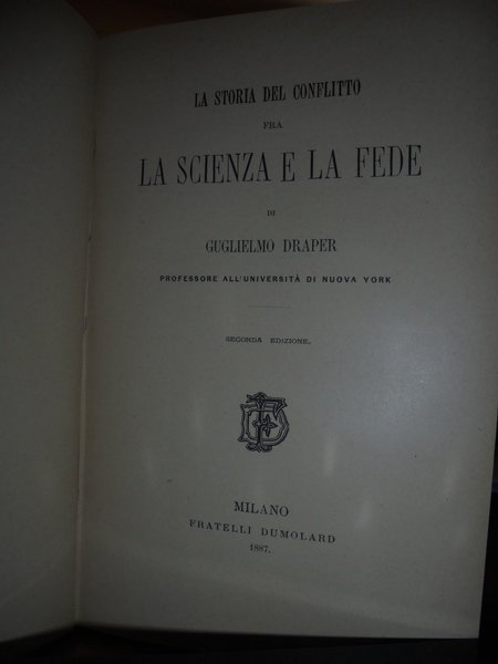 Guglielmo, Draper. Milano, Fratelli Dumolard, 1887. La storia del conflitto fra la scienza e la fede. In-8°, tela con titolo in oro entro tassello al dorso, copertina originali conservate. xxviii, 443 pp. Bell' esemplare. Uff. TV. mob. nostro
