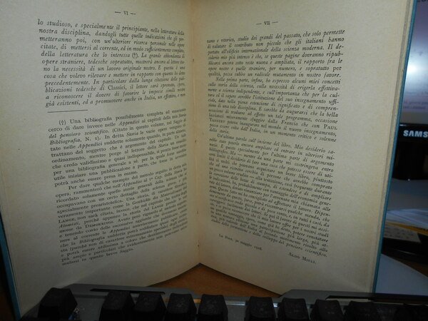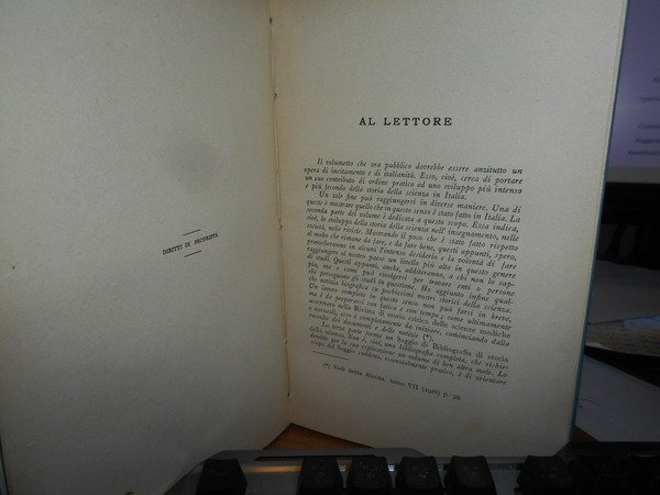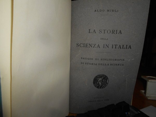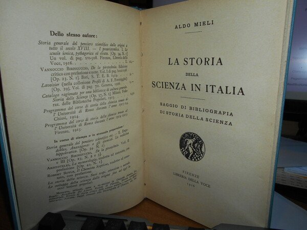 ALDO MIELI. Firenze, Libreria Della Voce, 1916. In-8° piccolo, tela con titolo in oro entro tassello al dorso, copertine originali conservate. vii, 130 pp. Perfetto esemplare in legatura anni '60 con le brossure originali conservate. Uff. C - I - 6