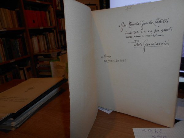 PAOLO GUICCIARDINI. Firenze, Leo S. Olschki Editore, 1948. LA STORIA GUICCIARDINIANA Edizioni e Ristampe. In-4°, br. edit. 45 pp. con 4 tavole f.t. Edizione di soltanto 100 esemplari numerati (n° 78). Opuscolo in ottimo stato di conservazione impreziosito da una dedica firmata dall' Autore. Neg. lett. mod. mob. M.