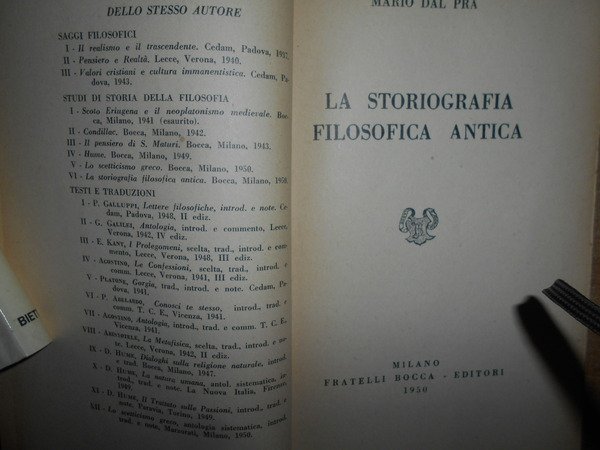 MARIO DAL PRA. Milano, Fratelli Bocca Editori, 1950. LA STORIOGRAFIA FILOSOFICA ANTICA. In-16° grande, br. orig. 305, (1) pp. Ben conservato. Neg. lett. mod. mob. E entro busta trasp.