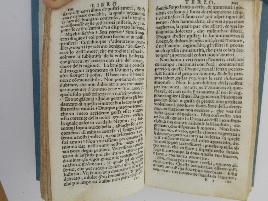 16 cm, pp. 216, rilegatura novecentesca in mezza pergamena, piatti in carta azzurrina. Frontespizio incorniciato con marca tipografica al centro: Torre con Angelo sulla cima. Rivisitazione della figura biblica di Susanna presente nel libro di Daniele. Esemplare molto buono, leggermente rifilato. *** TUTTI I NOSTRI LIBRI SONO VISIBILI PREVIO CONTATTO MAIL O TELEFONO NELLA NUOVA SEDE DI MILANO: LIBRERIA COSMOPOLIS, VIA JOMMELLI, 22. ***