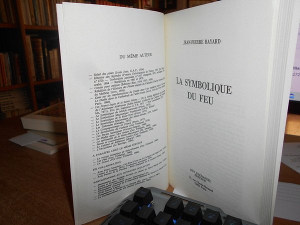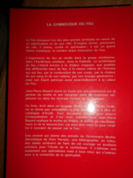 JEAN-PIERRE Bayard. Paris, Guy Trédaniel, 1986. La Symbolique du Feu. In-8°, br. 225, (1) pp. Come nuovo. Uff. stanzetta mob. a sinistra centro sotto