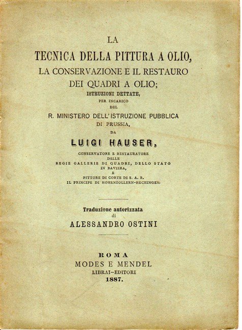 LA TECNICA DELLA PITTURA A OLIO, la conservazione e il restauro dei quadri a olio. Istruzioni dettate per incarico del R. Ministero dell'Istruzione pubblica di Prussia da… Conservatore e Restauratore delle Regie Gallerie…