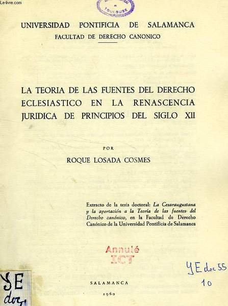 Universidad Pontificia de Salamanca. 1960. In-8 Carré. Broché. Bon état. Livré sans Couverture. Dos satisfaisant. Intérieur frais. Plaquette paginée de 318 à 370. Etiquette de code, tampons et annotations de bibliothèque en page de titre. Universidad Pontificia de Salamanca, Facultad de Derecho Canonico. Extracto de la Tesis Doctoral.