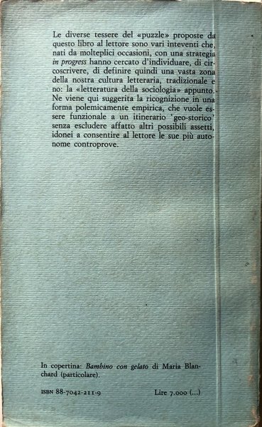 Le diverse tessere del «puzzle proposte da questo libro al lettore sono vari interventi che, nati da molteplici occasioni, con una strategia in progress hanno cercato d'individuare, di circoscrivere, di definire quindi una vasta zona della nostra cultura letteraria, tradizionale e no: la «letteratura della sociologia appunto. Ne viene qui suggerita la ricognizione in una forma polemicamente empirica, che vuole essere funzionale a un itinerario geo-storico