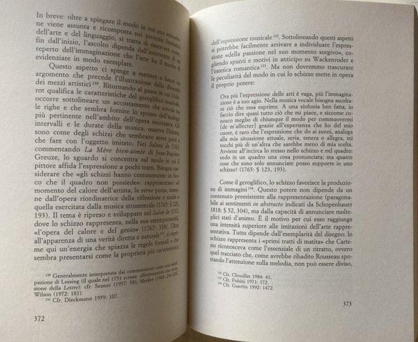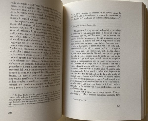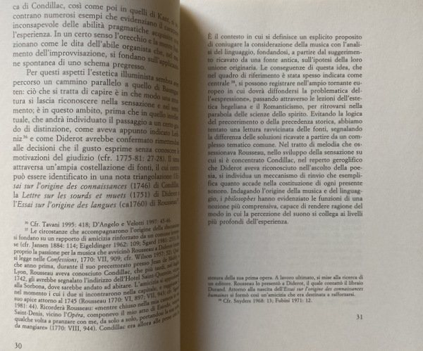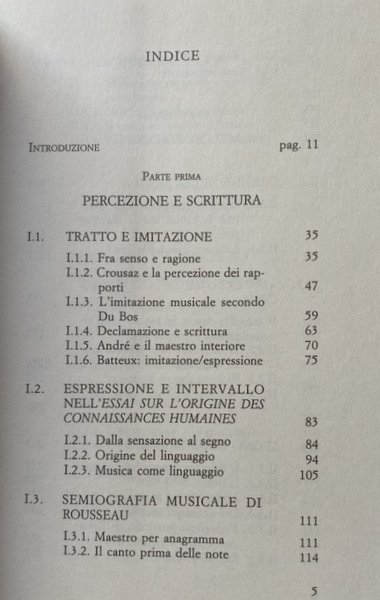 Soggetti: Musicologia, Filosofia, Ermeneutica, Estetica, Musica, Dialettica, Illuminismo, Linguaggio musicale, Suono, Sonorità, Suoni, Segni, Semiografia, Canto, Anagrammi, Percezione, Scrittura, Partiture, Note, Du Bos, Crousaz, Imitazione, André, Batteux, Melodia, Armonia, Rameau, D'Alembert, Natura, Rousseau, Lettre su la Musique française, Letteratura francese, Novecento, Essai sur l'origines des langues, Voce, Pedagogia, Educazione musicale, Carattere, Cantare, Canzoni, Traccia, Tracce, Espressione, Mimesi, Srods, Muets, Ascolto, Ascoltare, Neveu, Fantasma dell'opera, Condillac, Logica, Fonogramma, Studi culturali, Fonti, Consultazione, Riferimento, Storia, Bibliografia, Saggistica, Libri Vintage Fuori catalogo, Stili musicali, Aristotele, Poetica, Baud-Bovy, Beethoven, Berkeley, Chouillet, Bollino, Cartesio, Collisani, Derrida, Jimmy Doolittle, Didier, Diderot, Fubini, Foucault, Kant, Kintzler, Hobson, La Mettrie, Leibniz, Locke, Malebranche, Modica, Mozart, Pergolesi, Wilson, Orecchio, Storia, Dissertazioni, Teorie, Dispute, Vibrazioni, Fisica, Matematica, Jean-Philippe Rameau, Scritti teorici, Composizione, Lirica, Settecento, Enciclopedisti, Eulero, Romanticismo, Accordi, Effetti, Barocco, Compositori, Comunicazione, Espressività, Sentimento, Francia, Critica, Interpretazione, Musicology, Philosophy, Hermeneutics, Aesthetics, Music, Dialectics, Enlightenment, Musical language, Sound, Sonority, Sounds, Signs, Semiography, Singing, Anagrams, Perception, Writing, Scores, Notes, Imitation, Melody, Harmony, Nature, French literature, Twentieth century, Voice, Pedagogy, Music education, Character, Sing, Songs, Tracks, Expression, Listening, Listen, Phantom of the opera, Logic, Phonogram, Cultural studies, Sources, Consultation, Reference, History, Bibliography, Nonfiction, Out of print books, Musical styles, Aristotle, Poetics, Descartes, Ear, History, Dissertations, Theories, Disputes, Vibrations, Physics, Mathematics, Theoretical writings, Composition, Lyric, Eighteenth century, Encyclopedists, Euler, Romanticism, Chords, Effects, Baroque, Composers, Communication, Expressiveness, Sentiment, France, Criticism, Interpretation Collectibles Collezionismo