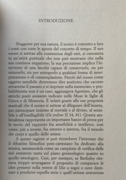 Il suono, ha scritto Hegel, è «un esteriorità che si sopprime nel suo sorgere con la sua stessa esistenza e sparisce in se stessa». Questa presenza fugace e negativa non sembra poter prescindere da un quid capace di trattenerla e di misurarla. Perciò del suono come oggetto sensibile dovremmo dire anzi tutto che «scorre attraverso il passato e si imprime nella memoria»; e probabilmente non è un caso, aveva aggiunto Agostino, che l'antica mitologia avesse riconosciuto nelle Muse le figlie di Giove e di Memoria. È infatti come ordine del senso, come traccia depositata nelle pieghe dell'anima, che il suono si sottrae al dileguare dell'istante, per penetrare nei suoi livelli più profondi e partecipare insieme del mortale e del divino, del sensibile e dell'intelligibile.