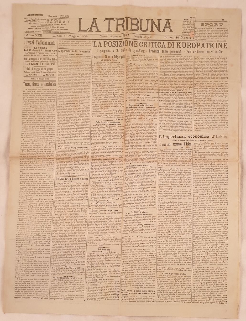 Numero del 16 maggio 1904 del quotidiano "La Tribuna" fondato a Roma nel 1883 dai politici Alfredo Baccarini e Giuseppe Zanardelli. Venne pubblicato fino al Novembre 1946.<BR>All'interno: La posizione critica di Kuropatkine, Nella Manciuria meridionale, L'importanza economica di Inkeu, La lega navale italiana a Parigi, il bombardamento di Dainy, il colloquio di Nisch, La gara musicale di Milano, 14 scheletri trovati presso Palermo, I romagnoli nell'Agro, Un comizio a Grottaferrata, il comizio anticlericale di Terni, scandalo Nasi, Tor di Quinto ecc.<BR>In buone condizioni. Raro. Brossura editoriale in buone condizioni generali con lievi usure ai margini e dorso. Piegature. Legatura assente. All'interno le pagine si presentano in buone condizioni con rare fioriture. Parte mancante alla prima pagina con perdita di testo. In folio. Dim. 60,5x45 cm. Pp. 6. Number of the 16th of may 1904 of the daily magazine "La Tribuna" established in Rome in 1883 by the politicians Alfredo Baccarini and Giuseppe Zanardelli. It was published until the november 1946.<BR>Inside: the position of Kuropatkine, In southern Manciuria, the economic importanceInkeu, italian naval league in Paris, the bombing of Dainy, the speech of Nisch, the musical award in Milan, 14 skeletons found near Palermo, romagnoli in Agro, Grottaferrata, Terni, scandalo Nasi, Tor di Quinto.<BR>In good conditions. Editorial cover in good general conditions slightly worn in the edges and spine. Foldings. Binding is missing. Inside pages are in good conditions with occasional foxings. Missing part in the first page with loss of text. In folio. Dim. 60,5x45 cm. Pp. 6.
