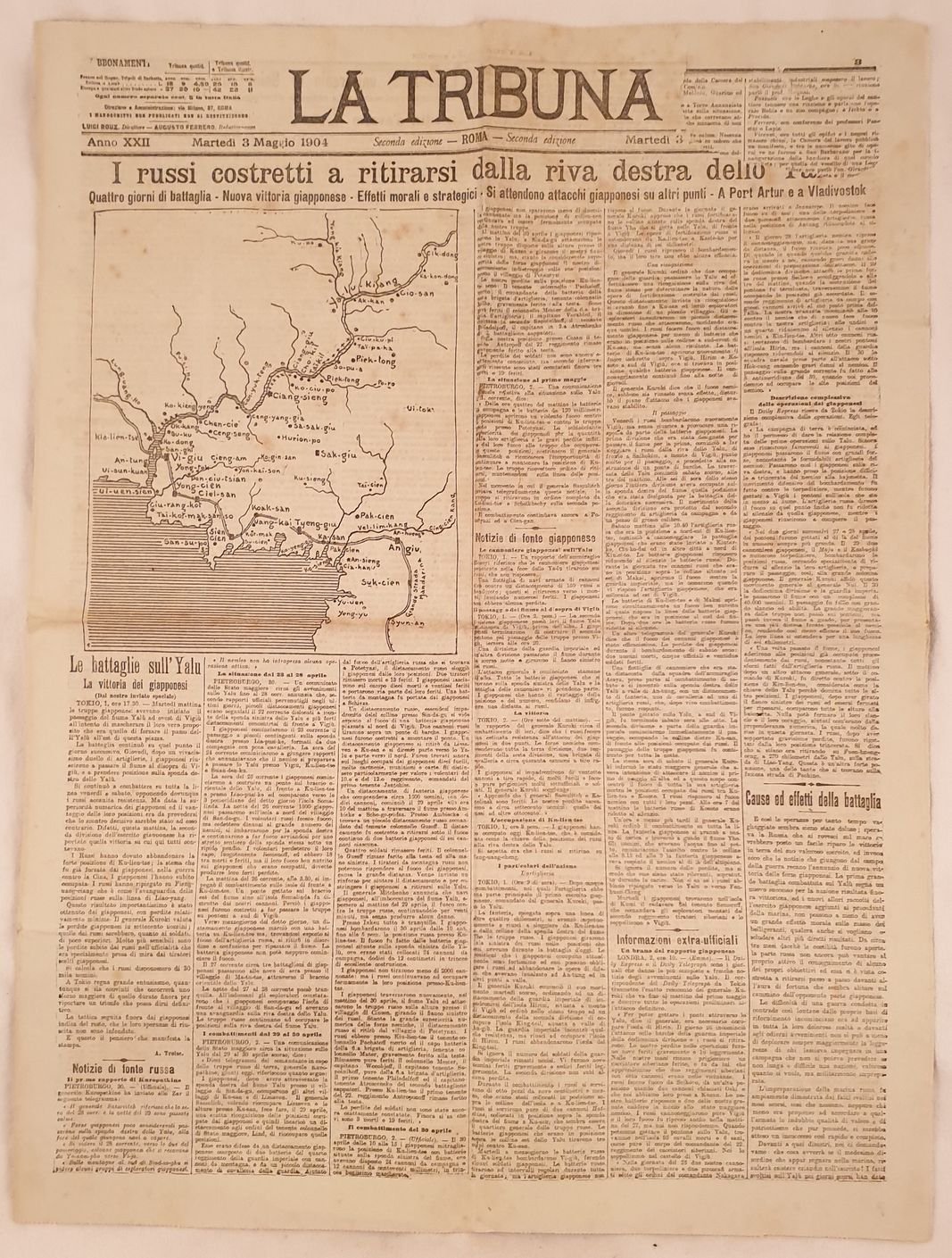 Numero del 3 maggio 1904 del quotidiano "La Tribuna" fondato a Roma nel 1883 dai politici Alfredo Baccarini e Giuseppe Zanardelli. Venne pubblicato fino al Novembre 1946.<BR>All'interno: I russi costretti a ritirarsi dalla riva destra, le battaglie sull'Yalu, L'esposizione universale di Saint Louis, Come passo il primo maggio in Italia, la mostra regionale romagnola, Il ritorno di Loubet a Parigi, La presa di Illig ecc. In buone condizioni. Raro. Brossura editoriale in buone condizioni generali con lievi usure ai margini e dorso. Piegature. Legatura assente. All'interno le pagine si presentano in buone condizioni con rare fioriture. Parte mancante alla prima pagina con perdita di testo. In folio. Dim. 60,5x45 cm. Pp. 6. Number of the 3rd of may 1904 of the daily magazine "La Tribuna" established in Rome in 1883 by the politicians Alfredo Baccarini and Giuseppe Zanardelli. It was published until the november 1946.<BR>Inside: Russian forced to escape in right river, the battles of Yalu, Universal exposition of Saint Louis, the 1st of may in Italy, regional exibition in Romagna, Loubet in Paris, Illig. In good conditions. Editorial cover in good general conditions slightly worn in the edges and spine. Foldings. Binding is missing. Inside pages are in good conditions with occasional foxings. Missing part in the first page with loss of text. In folio. Dim. 60,5x45 cm. Pp. 6.