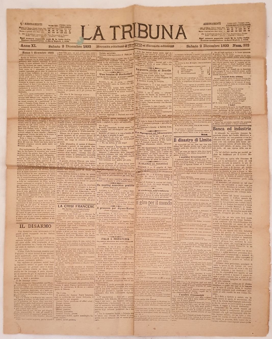 Numero del 2 dicembre 1893 del quotidiano "La Tribuna" fondato a Roma nel 1883 dai politici Alfredo Baccarini e Giuseppe Zanardelli. Venne pubblicato fino al Novembre 1946.<BR>All'interno: Una bomba di Rochefort, Il disastro di Limito, La guerra civile al Brasile, Italia e Inghilterra: nuovo discorso del Conte Tornicilli, La crisi del mobiliare a Torino, L'On. Chimirri contro Achille Fazzari, Pietro Sbarbaro ecc. In buone condizioni. Raro. Brossura editoriale in buone condizioni generali con lievi usure ai margini e dorso. Piegature. Legatura assente. All'interno le pagine si presentano in buone condizioni con rare fioriture. Parti mancanti alla prima pagina con perdita di testo. In folio. Dim. 56x45 cm. Pp. 4. Number of the 2nd of december 1893 of the daily magazine "La Tribuna" established in Rome in 1883 by the politicians Alfredo Baccarini and Giuseppe Zanardelli. It was published until the november 1946.<BR>Inside: A bomb of Rochefort, the disaster of Limito, civil war in Brasil, Italy and England: new speech of Conte Tornicilli, Crisis of house market in Torino, On. Chimirri against Achille Fazzari, Pietro Sbarbaro <BR>In good conditions.Editorial cover in good general conditions slightly worn in the edges and spine. Foldings. Binding is missing. Inside pages are in good conditions with occasional foxings. Losses in the first page with loss of text. In folio. Dim. 56x45 cm. Pp. 4.