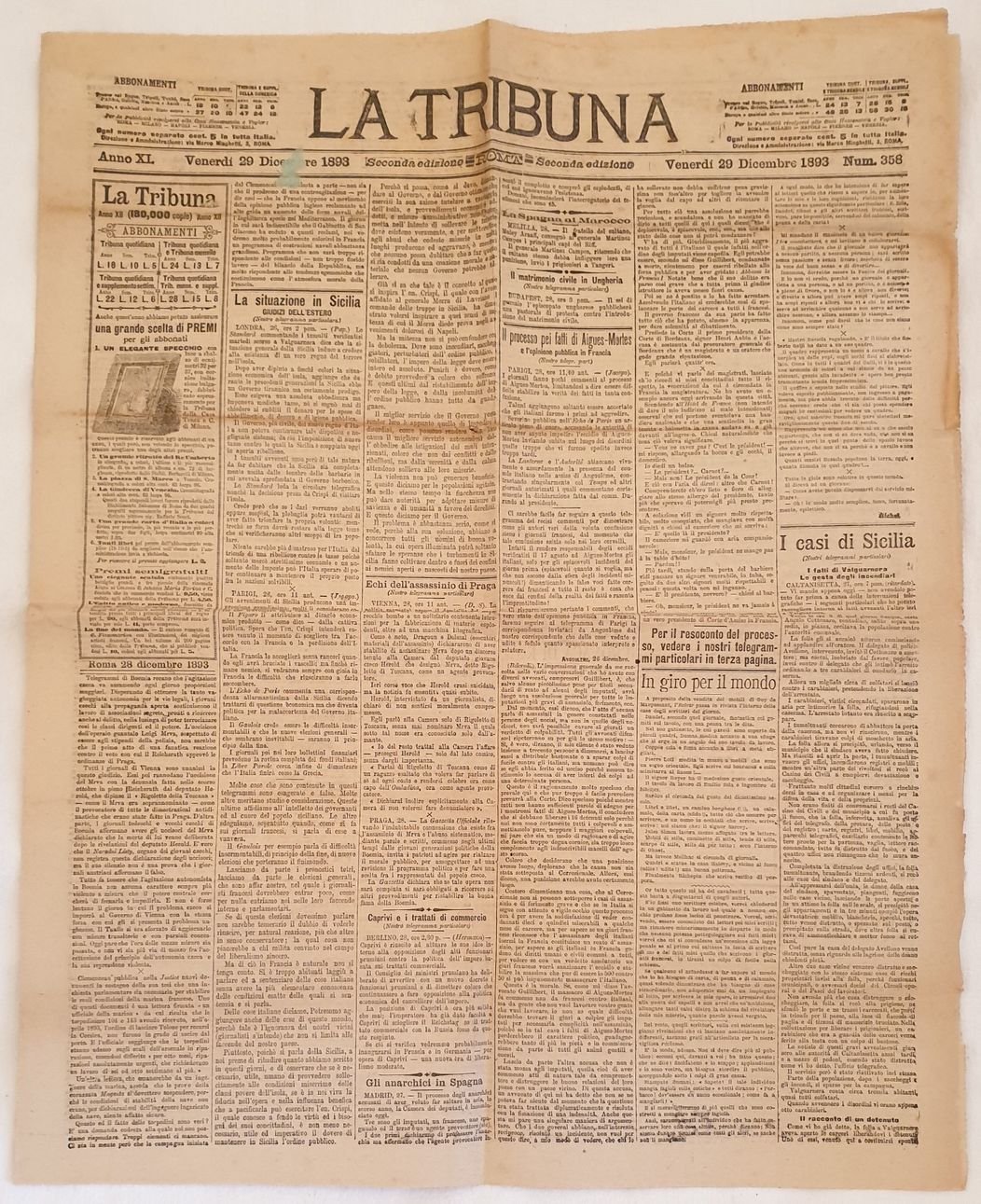 Numero del 29 dicembre 1893 del quotidiano "La Tribuna" fondato a Roma nel 1883 dai politici Alfredo Baccarini e Giuseppe Zanardelli. Venne pubblicato fino al Novembre 1946.<BR>All'interno: La situazione in Sicilia, Il processo pei fatti di Aigues Mortes, Sicilia: i fatti di Valguarners le gesta degli incendiari, Echi dell'assassinio di Praga, Caprivi e i trattati di commercio, Gli anarchici in Spagna, Il generale Morra, A Lersara, Il grido di ieri sera al Costanzi, La Sicilia ed il governo ecc.<BR>In buone condizioni. Raro. Brossura editoriale in buone condizioni generali con lievi usure ai margini e dorso. Piegature. Legatura assente. All'interno le pagine si presentano in buone condizioni con rare fioriture. Parte mancante alla prima pagina con perdita di testo. Parte mancante alla prima pagina con perdita di testo. In folio. Dim. 55,5x45,5 cm. Pp. 4. Number of the 29th of december 1893 of the daily magazine "La Tribuna" established in Rome in 1883 by the politicians Alfredo Baccarini and Giuseppe Zanardelli. It was published until the november 1946. Inside: Situation in Sicily, The trial for the happenings of Aigues Mortes, Sicily: the happenings of Valguarners, Echoes of murderers of Praga, Caprivi and tarde treatis, The General Morra, A Lersara, Sicily and government. In good conditions. Editorial cover in good general conditions slightly worn in the edges and spine. Foldings. Binding lacks. Inside pages are in good conditions with occasional foxings. Missing part in the first page with loss of text. In folio. Dim. 55,5x45,5 cm. Pp. 4.