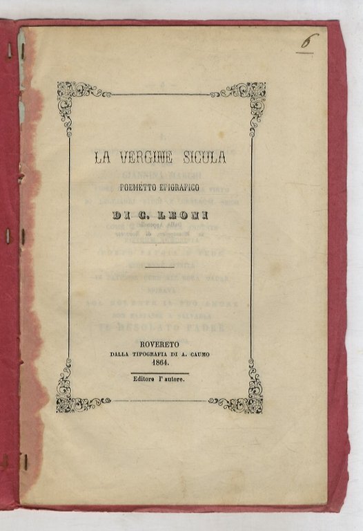 Rovereto, Caumo, 1864, in-8, copertina muta. pp. 14. (Testo inquadrato da fregio tipografico). Ritratto.
