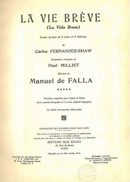 La vie brève. (La vida breve). Drame lyrique en 2 actes et 4 tableaux. Adaptation française de Paul Millet. (ME 400)