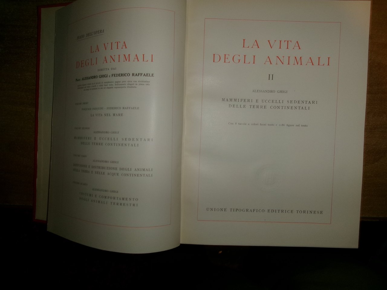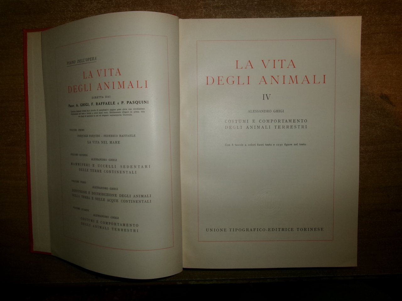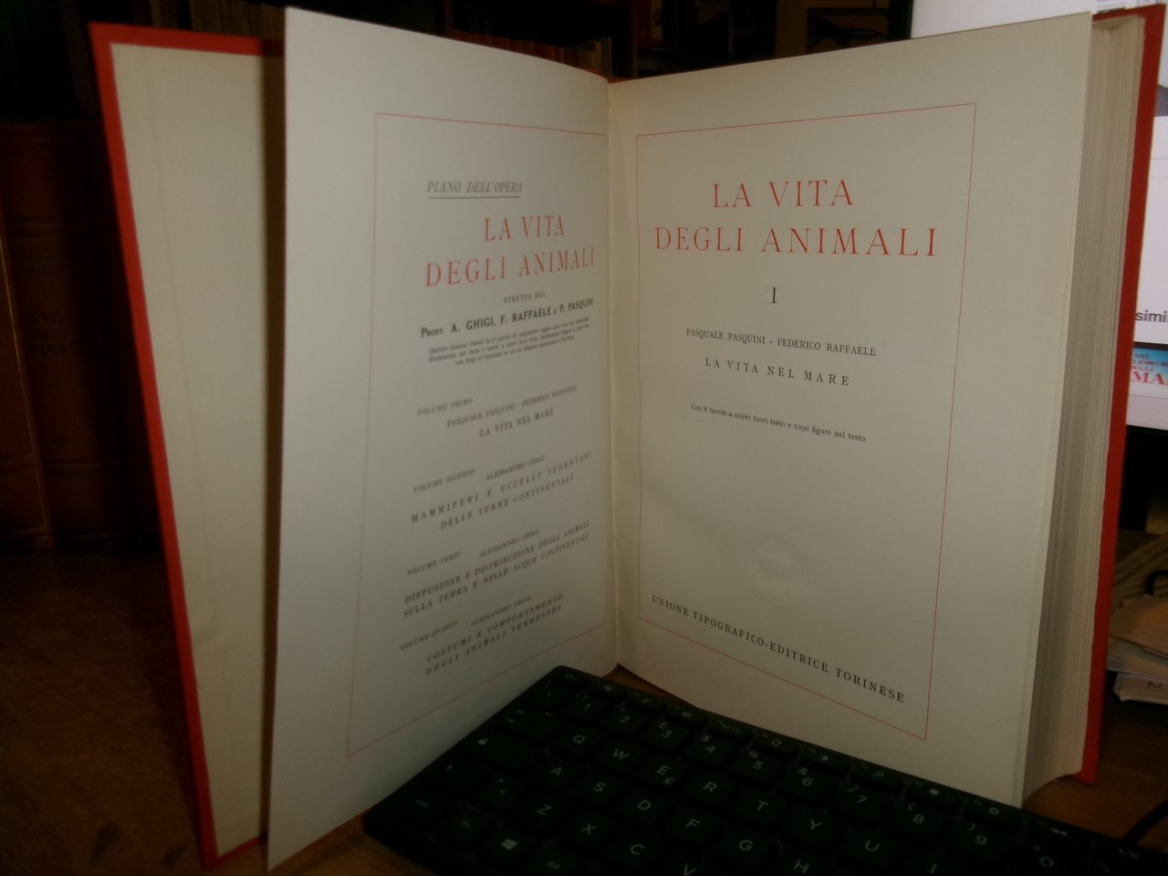 PASQUALE PASQUINI - FEDERICO RAFFAELE - Alessandro Ghigi. Torino, U.T.E.T., 1950 - 1951. La Vita degli Animali. 4 volumi in-8° grande, tela edit. con titoli in oro. La vita nel mare. xi, 837 pp. con 8 tavole a colori f.t. e 1090 figure n.t.; Mammiferi e uccelli sedentari delle terre continentali. xii, 954 pp. con 8 tavole a colori f.t. e 1186 figure n.t. Diffusione e distribuzione degli animali sulla terra e nelle acque continentali. xii, 971 pp. con 8 tavole a colori f.t. e 1392 figure n.t. Costumi e comportamento degli animali terrestri. viii, 825 pp. con 8 tavole a colori f.t. e 1230 figure nel testo. Volumi classificati in buono stato di conservazione perchè non sono presenti le sovracopertine e le copertine in tela sono lievente sbiadite al dorso e con alcuni segni del tempo. Interni ottimi. Uff. stanzetta a sinistra in basso.