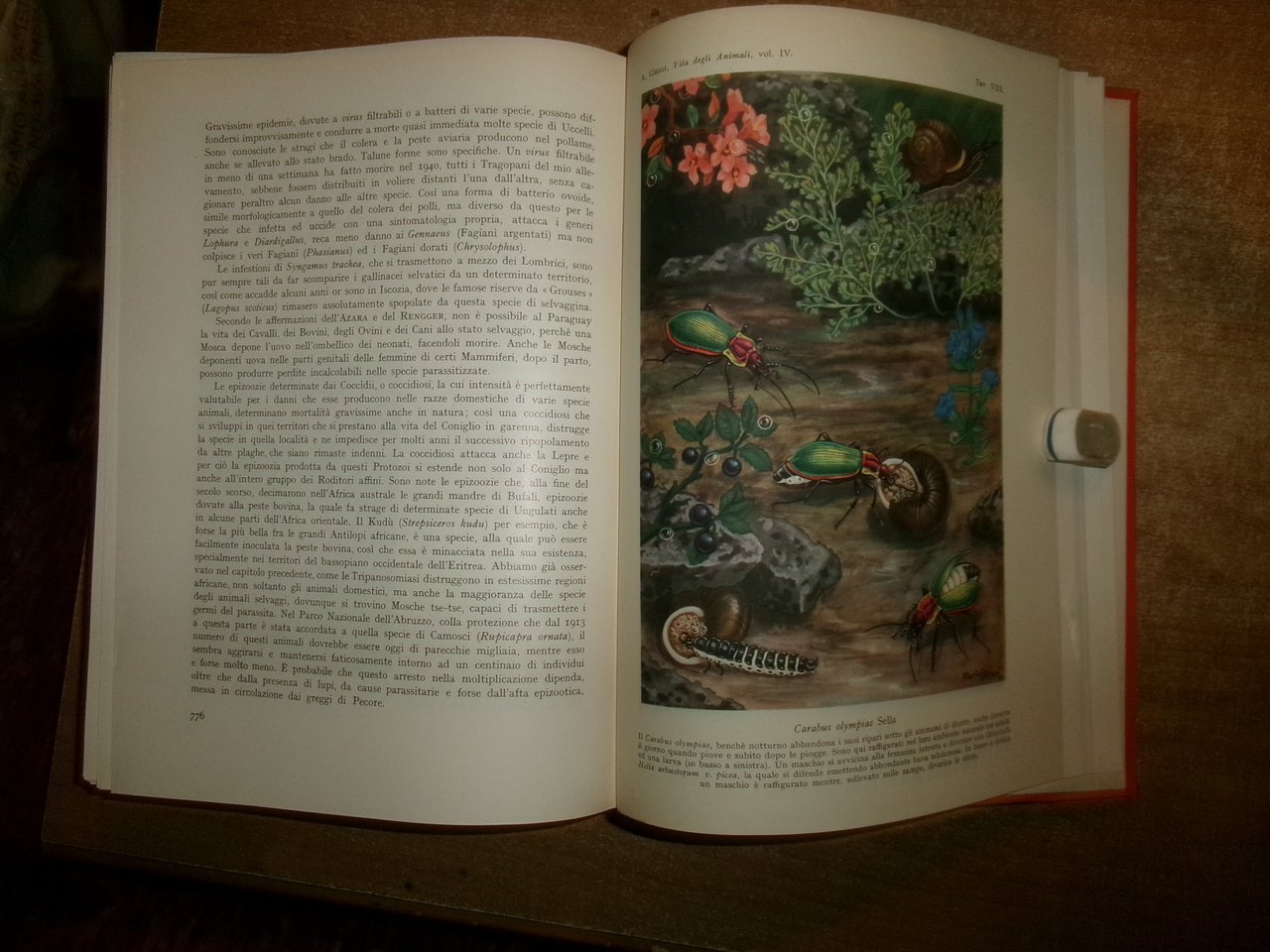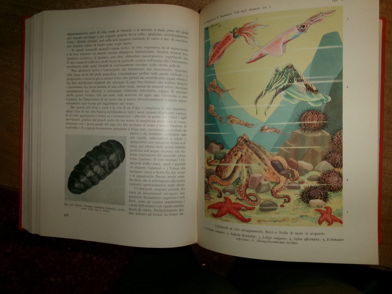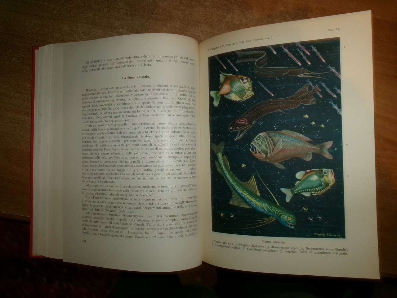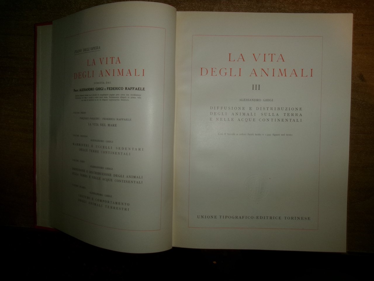 PASQUALE PASQUINI - FEDERICO RAFFAELE - Alessandro Ghigi. Torino, U.T.E.T., 1950 - 1951. La Vita degli Animali. 4 volumi in-8° grande, tela edit. con titoli in oro. La vita nel mare. xi, 837 pp. con 8 tavole a colori f.t. e 1090 figure n.t.; Mammiferi e uccelli sedentari delle terre continentali. xii, 954 pp. con 8 tavole a colori f.t. e 1186 figure n.t. Diffusione e distribuzione degli animali sulla terra e nelle acque continentali. xii, 971 pp. con 8 tavole a colori f.t. e 1392 figure n.t. Costumi e comportamento degli animali terrestri. viii, 825 pp. con 8 tavole a colori f.t. e 1230 figure nel testo. Volumi classificati in buono stato di conservazione perchè non sono presenti le sovracopertine e le copertine in tela sono lievente sbiadite al dorso e con alcuni segni del tempo. Interni ottimi. Uff. stanzetta a sinistra in basso.