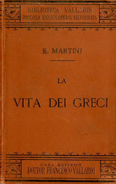 VII, 152 p. : ill. ; 18 x 11 cm. Biblioteca Vallardi. Piccola enciclopedia illustrata. Quali dei veneravano gli antichi Greci? Dove si svolgevano le Olimpiadi? Cos'è il giuramento di Ippocrate? Un viaggio nella storia dell'uomo. Gli antichi Greci hanno lasciato all'umanità un ricchissimo patrimonio in tutti i campi del sapere: dalla scienza alla medicina, dalla politica alla filosofia, dalla poesia al teatro e all'architettura. La data di pubblicazione è ricavata dall'«Avvertenza», "giugno 1897". . Legatura editoriale, coperta in cartone rigido di colore marrone, con impresso il titolo in nero al piatto e al dorso. Libro illustrato da 34 figure in b/n. Segno del tempo alla coperta e al taglio (brunitura), con fioriture sparse alle pagine interne, qualche sottolineatura a penna e a matita in alcune pagine, per il resto libro accettabile. Codice libreria 4966.