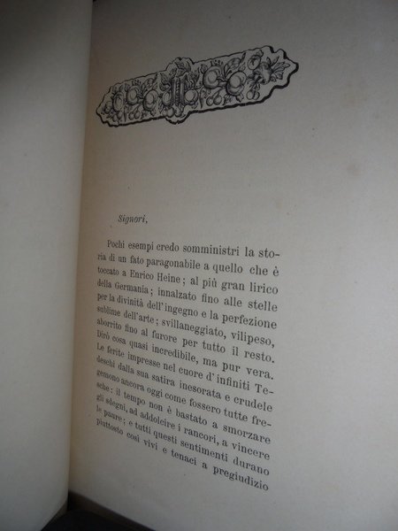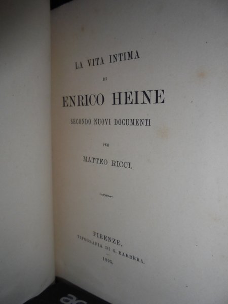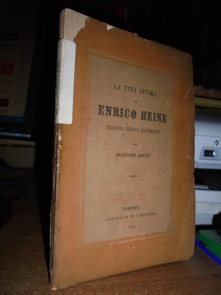 La vita intima di ENRICO HEINE secondo nuovi documenti per Matteo Ricci. Firenze, Tip. di G. Barbera, 1895. In-16°, br. orig. 113 pp. Brossura lievemente danneggiata, interno ottimo stato. Neg. Bol. mob. S. carc.
