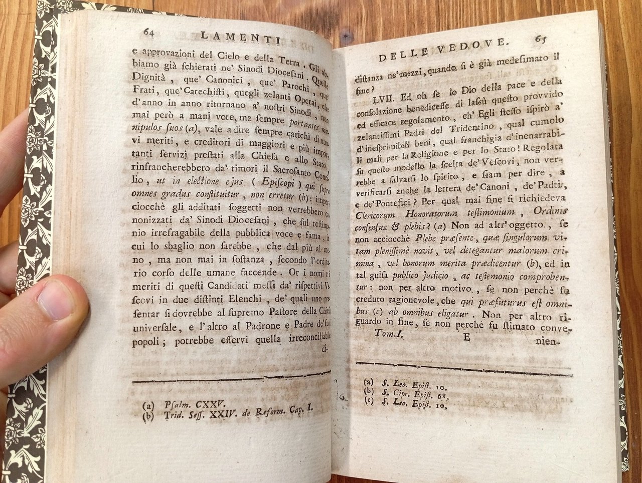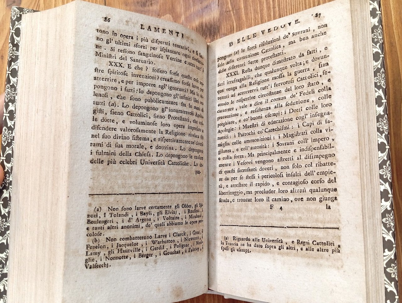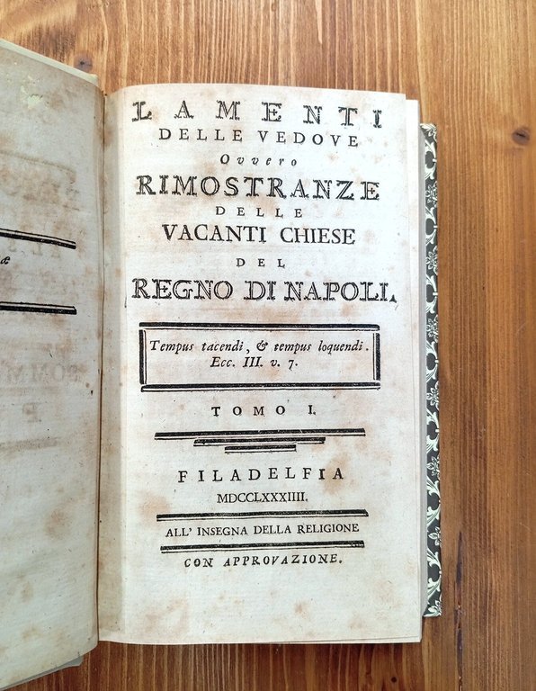 Opera completa di due tomi in un unico volume, rilegatura amatoriale moderna in mezza pergamena con titolo in nero al dorso, piatti in carta decorata, 264 + 200 pagine. Dense fioriture e bruniture alle carte; il testo risulta comunque ben leggibile e privo di lacune o tarlature; nel complesso buon esemplare di una settecentina piuttosto rara, specie completa -- Raccolta di sette rimostranze in cui l'autore lamenta la mancanza di vescovi e l'abbandono in cui erano state lasciate le Chiese ("vedove") del Regno di Napoli. Esse erano rivolte a illustri personaggi: papa Pio VI, Ferdinando IV re delle Sicilie, Maria Carolina d'Austria regina delle due Sicilie, i segretari di Stato del re di Napoli, i monsignori confessori, gli arcivescovi, vescovi e prelati del Regno, all'avvocato della Real Corona. Luogo di stampa falso, probabilmente Napoli (Cfr. Parenti).
