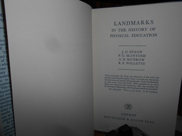 P.C. Mcintosh. J.G. Dixon. A.D. Munrow. R.F. Willetts. London, Routledge & Kegan Paul, 1969. Landmarks in the History of Physical Education. In-8°, tela edit. azzurra con titolo in oro al dorso, sovracopertina. ix, 218 pp. con alcune tavole f.t. Come nuovo. Uff. C - IV - 6