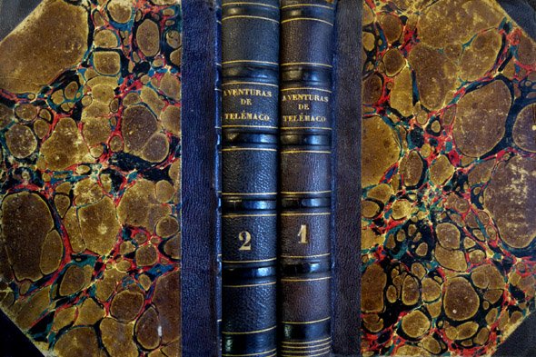 Paris, por Bossange, Masson y Besson, 1804 (An XII). Dos volúmenes en 4to. menor; 2 hs., 215 pp. para el texto en inglés y 215 pp. para el texto en castellano + 3 hs., 202 pp. para el texto en inglés y 202 pp. para el texto en castellano. Encuadernación en media piel de la época, con lomera ornada y puntas. Curiosísima edición del texto clásico francés para la didáctica bilingüe del español y el inglés, las lenguas que iban a dar al traste con la aventura napoleónica, más atrevida que la de Ulises.