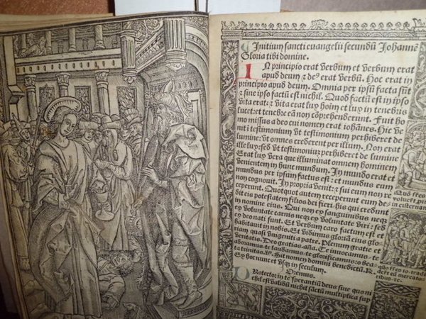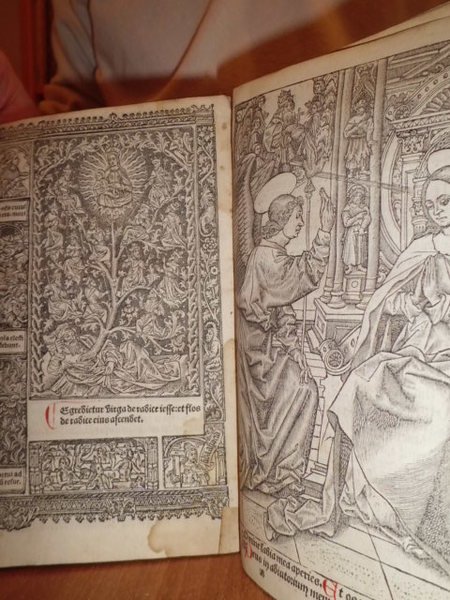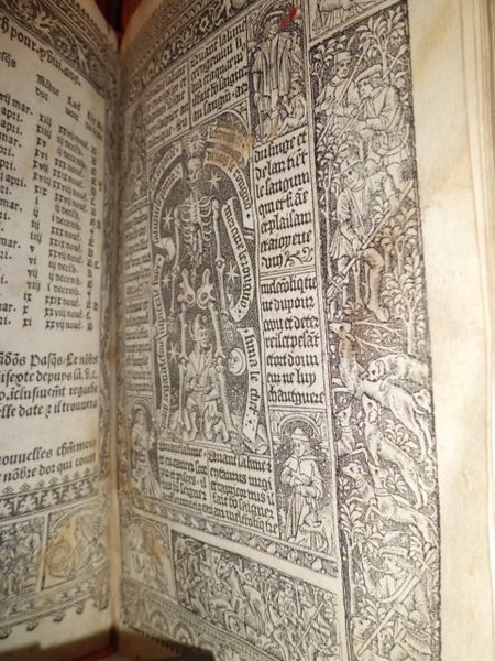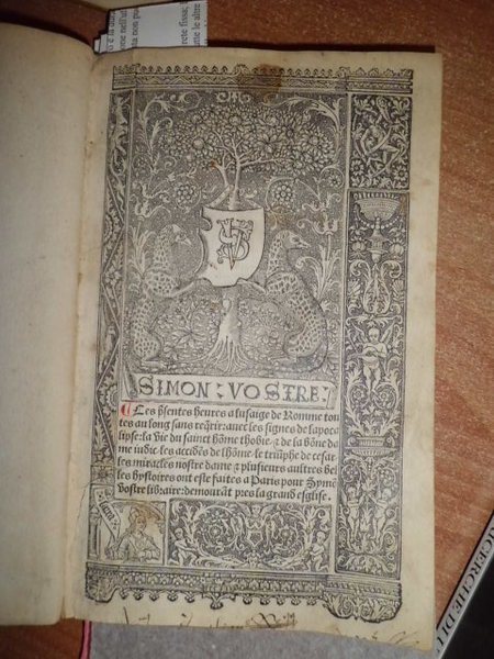 HEURES a l' Usage de Rome. Simon Vostre. Ces presentes Heures à l' usage de Romme toutes au long sans requerir, avec les signes de l' Apocalipse, le vie du sainct homme Thobie et de la bonne dame Judic, les accidents de l' homme, le triumphe de César, les miracles Nostre Dame et plusieurs autres belles histories ont este faites à Paris pour Symon Vostre libraire demourant près la grand Esglise. (A1(verso:) Almanach pour XVIII ans. (B1:) Initium sancti Evangelii secundum Joannem gloria tibi Domine. (o6:) S' ensuyt la table de ces presentes Heures.(Colophon:) Plusieurs belles oraisons et louenges en l' honneur de la Vierge Marie tanten latin que en françois. (Paris, circa 1508 - 18). In - 4° piena pelle secentesca (senza dorso, piani staccati). 99 ff. (anziché 104). Mancano A2, A3, D2, e7, e8. Collazione: A - B8, C4, D - I.8, K6, a - i8, 06. L' opera è stampata in carattere gotico con grandi iniziali rosse o azzurre; il testo è racchiuso in bordura istoriata ed è illustrato da 21 bellissime silografie a piena pagina e 3 altre silografie centrali. L' esemplare è corto di margine, con piccoli restauri angolari nei ff. I.1 e 1.5, con lieve perdita di stampa. Rarissima edizione che, per la collazione corrisponderebbe a quella descritta da Lacombe, 179 e Bohatta, 883, ma ha un titolo diverso.