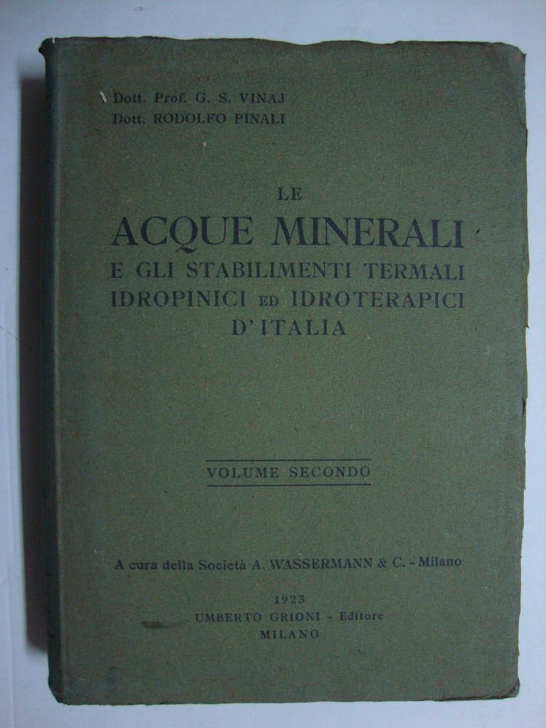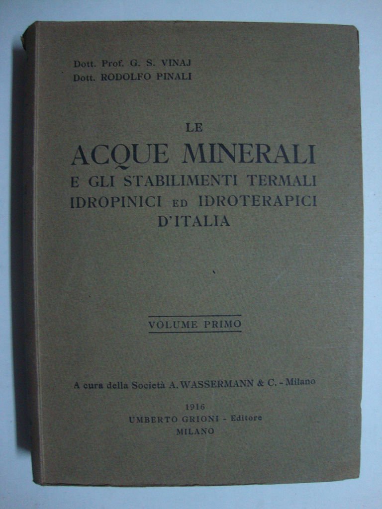 Opera divisa in due parti: vol.I - Il caldo e il freddo in idrologia medica, elettroterapia, terapia inalatoria, la radioattività delle acque minerali - (Piemonte - Liguria - Lombardia - Emilia - Toscana - Umbria), vol.II - Idro-Crio e Termoterapia - (Veneto - Marche - Lazio - Abruzzi e Molise - Campania - Basilicata - Puglie - Calabria - Sicilia - Sardegna - Venezia Giulia - Venezia Tridentina) - A cura della Società A. Wassermann & C. (Milano). Il secondo volume venne pubblicato nel 1923 a distanza di anni dalla pubblicazione del primo volume (1916) (64c).