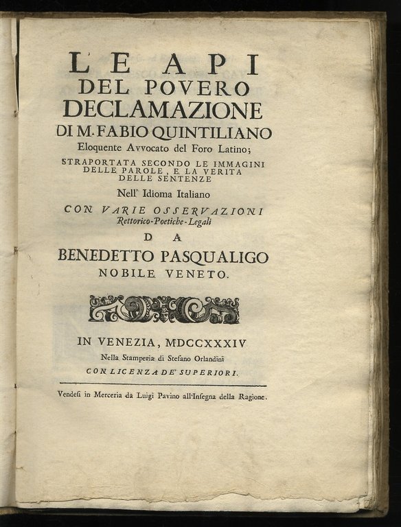 Le Api del povero declamazione di M. Fabio Quintiliano eloquente avvocato del Foro latino; trasportata secondo le immagini delle parole, e la verità delle sentenze nell'idioma italiano con varie osservazioni Rettorico-Poetiche-Legali da Benedetto Pasqualigo nobile veneto.