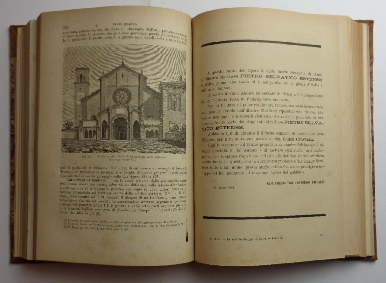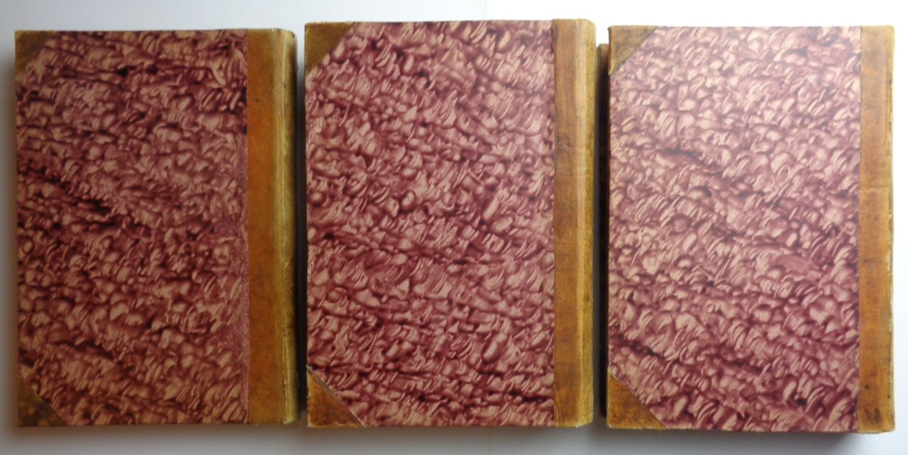 Tre volumi (27 cm) rilegati in mezza pelle a punte con titolo dorato al dorso. Vol 1, L'Arte Antica: di XV-384 pagine, con 69 figure nel testo e una tavola incisa fuori testo (su 14). Vol 2, Il Medio Evo: di XX- 538 pagine ( mancano due pp di sommario) con 212 figure nel testo e 20 tavole incise fuori testo (su 26). Vol 3, L'Evo Moderno: di XVI-471 pagine, con 150 figure nel testo e 40 tavole incise fuori testo. Condizioni molto buone per questa opera che venne pubblicata in fascicoli nel corso di due anni (da qui la mancanza di alcune delle tavole fuori testo, che venivano rilegate al termine della pubblicazione della serie di fascicoli). Raro, nei tre volumi.