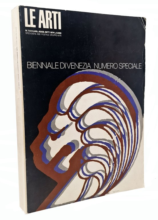 'Le Arti' luglio agosto settembre 1974 / Anno XXIV n. 7/8/9. Pagine: XVI + [4] + 466 + [2]. Formato: 24 x 33,5 cm circa. Stato di conservazione: leggere pieghette e lievi stropicciature sui margini della copertina,grinze appena accennate sulla copertina posteriore ma, nel complesso, un esemplare ben conservato. Privo di mancanze o segni a matita o penna. Brossura editoriale illustrata a colori con opera di Pino Tovaglia sul piatto anteriore. Corposo numero dedicato esclusivamente alla Biennale di Venezia, ricco di immagini in nero e a colori nel testo.