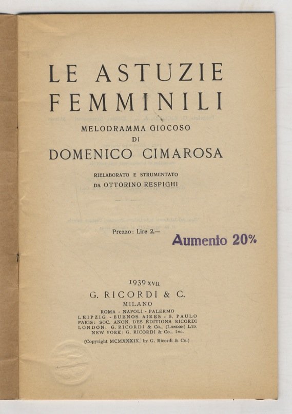 Le astuzie femminili. Melodramma giocoso di Domenico Cimarosa. Rielaborato e strumentato da Ottorino Respighi.