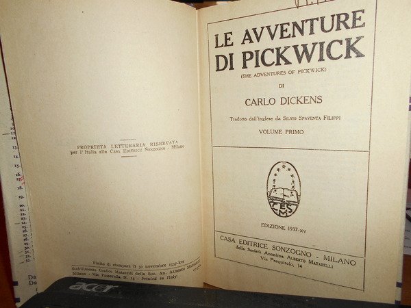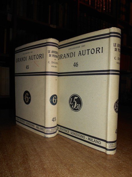 di Carlo Dickens. Milano, Casa Editrice Sonzogno, 1933/1937. Le Avventure di Pickwick. 2 volumi in-16°, tela edit. con titoli impressi, sovracopertine. 444, 444 pp. Lievi segni d' uso alle sovracopertine ma ben conservati. Uff. TV. carc. entro busta trasp.