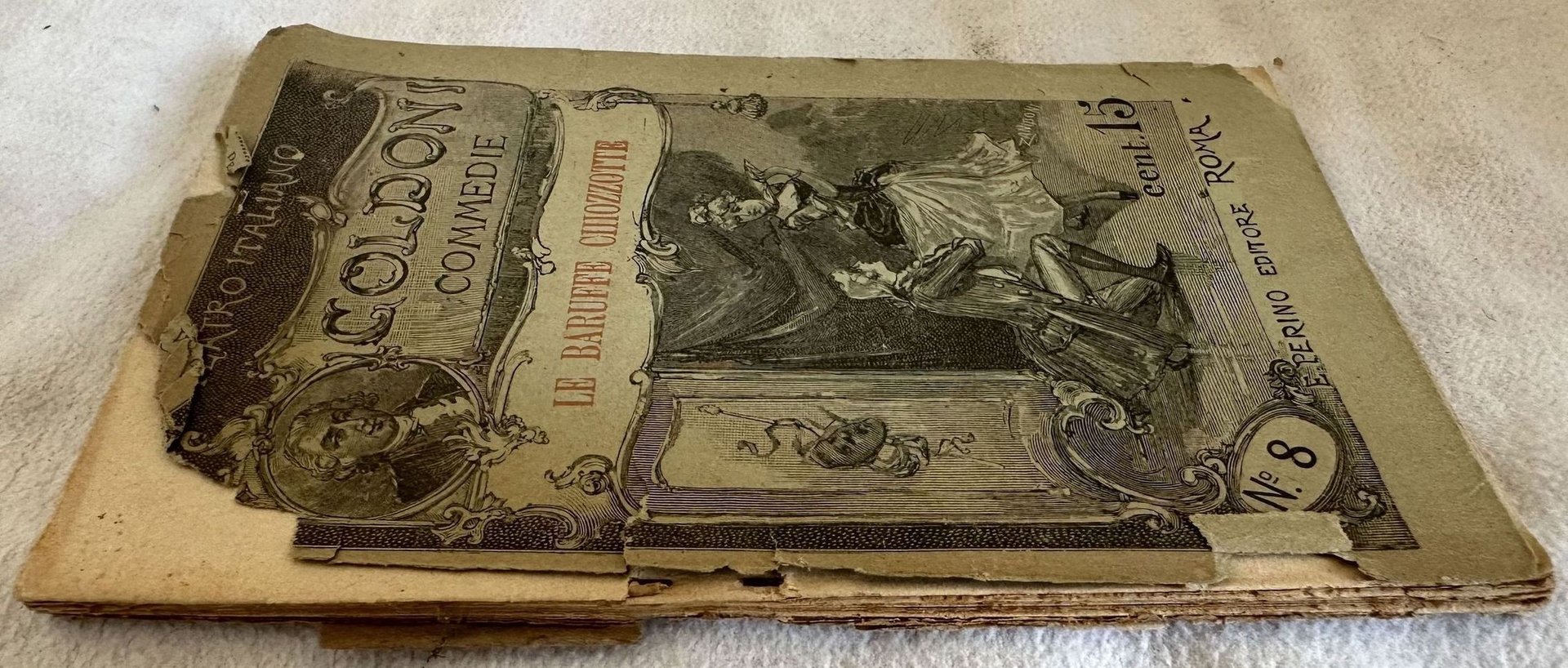 Edizione Perino del 1890 della commedia "Le baruffe chiozzotte" di Carlo Goldoni della collana "Teatro italiano". Sono presenti due incisioni a piena pagina, una delle quali in antiporta. In mediocri condizioni. Copertina editoriale in discrete condizioni con lievi usure marginali. Piatto anteriore staccato. Legatura in discrete condizioni con lievi rotture. Antiporta staccata. Pagine in buone condizioni generali con fioriture. In 16. Dim. 17,5x11 cm. Pp. 64.Perino edition of 1890 off the play "Le baruffe chiozzotte" by Carlo Goldoni of the series "Teatro italiano". Inside there are two engravings, one of them in the frontspice. In poor conditions. Editorial cover in fair conditions lightly worn in the extremities. Frontspice is detached. Binding in fair conditions with light cracks. Pages are in good conditions with foxing. In 16. Dim. 17,5x11 cm. Pp. 64.