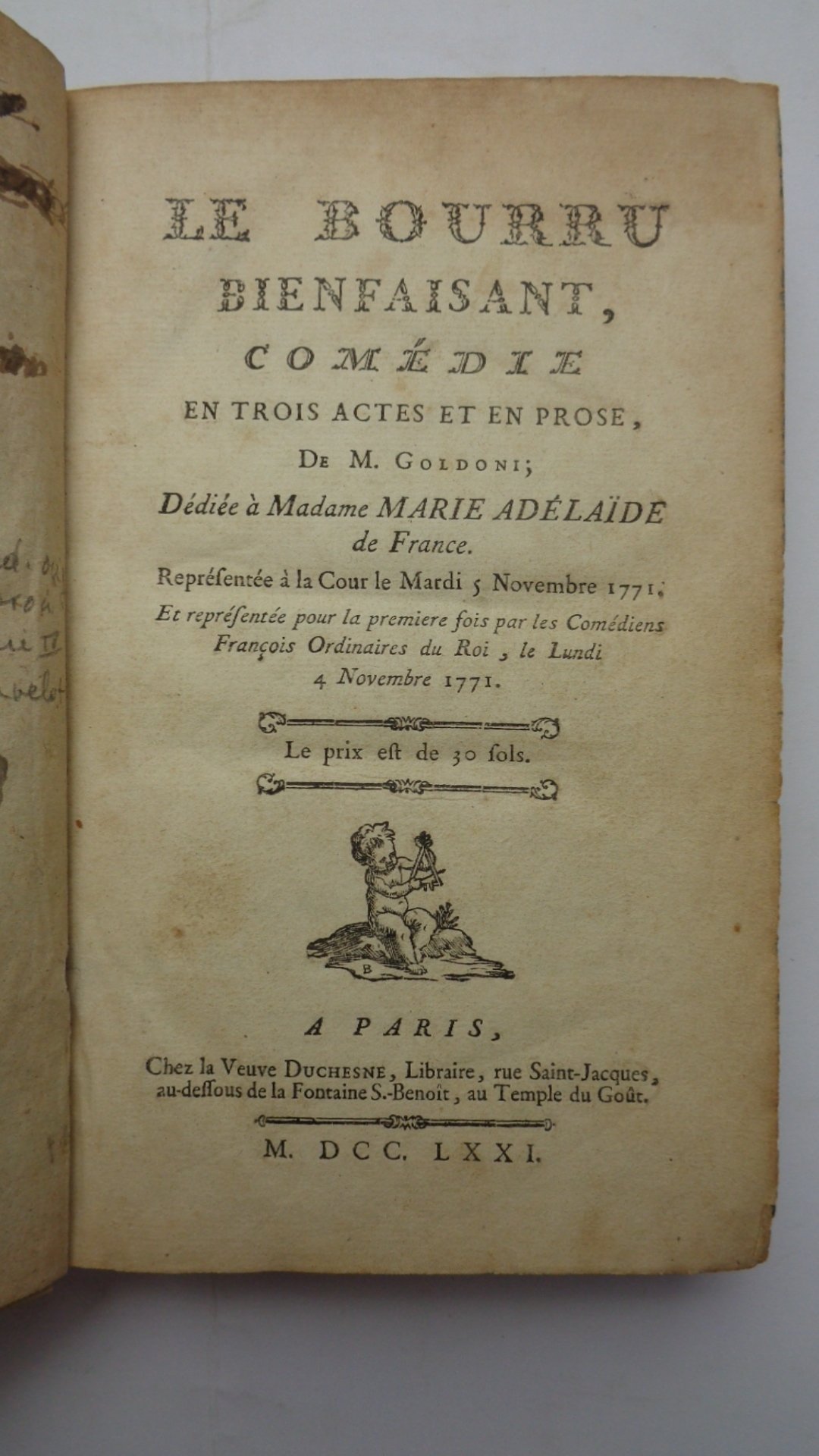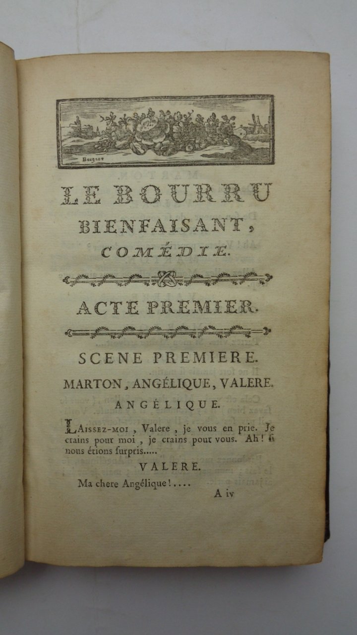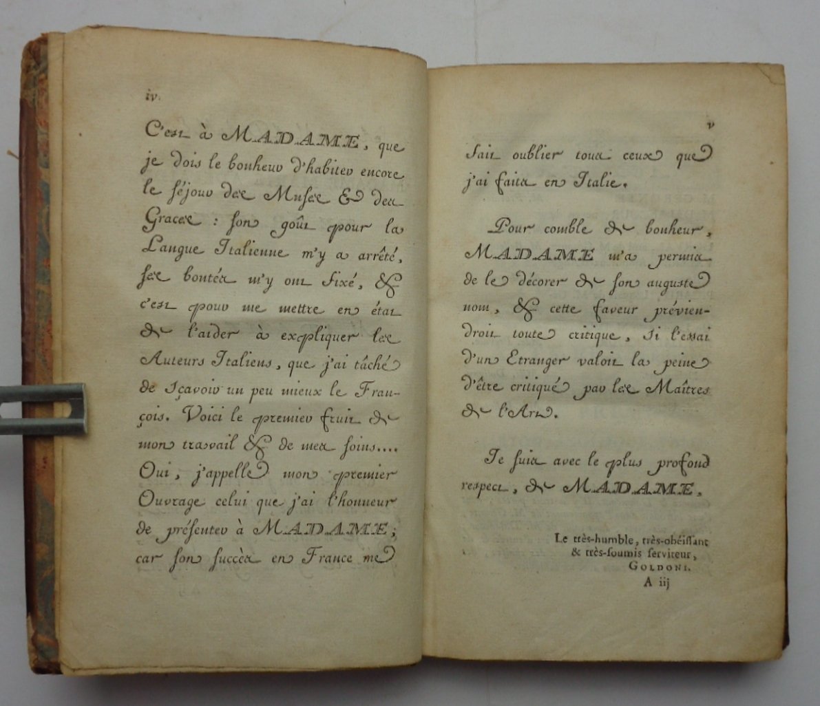 Dediée à Madame Marie-Adelaide de France. Representé à la Cour le mardi 5 novembre 1771, et Representée pour la premiere fois par le Comediens Ordinaires du Roi le Lundi 4 novembre 1771. VI-106 pagine. Tre incisioni a striscia di Beuguet. Edizione originale della commedia di Goldoni. Si trova, come prima opera, in un volume che raccoglie altre due pieces teatrali: LE PHILOSOPHE SANS LE SAVOIR, di Sedaine (Paris, Herissant, 1766) - LA PARTIE DE CHASSE DE HENRI IV di Collé (Paris, Dichesne, 1766, con 4 incisioni di Gravelot). Tre opere in un volume in 8o. Legatura coeva in piena pelle marmorizzata, dorso liscio ornato e dorato, DIFETTI alla legatura: fenduta la cerniera anteriore, angoli smussati, manca la cuffia suoperiore.