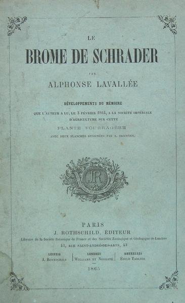 Paris, Rothschild éditeur, 1865. In/8 broché, couverture imprimée, 2 belles gravures rempliées en couleur de de Riocreux, 70 pages, 1 f. Dernière page avec de petits “grignotages” par des insectes en fin d’ouvrage (sans manque de texte). Développement du mémoire lu le 3 février 1864 à la Société Impériale d’Agriculture : origine de la culture, mode de végétation, rendement, valeur nutritive, influence sur la production du lait, analyse chimique, place dans l’assolement, nature du terrain, soins de culture.