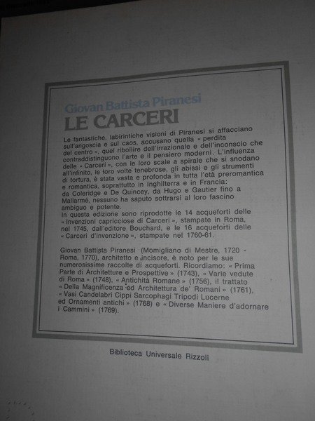 Giovan Battista Piranesi. Milano, Rizzoli, 1975. LE CARCERI. Prima edizione. In-4° piccolo, cartoncino edit. 21, (1) pp. con XVI tavole in nero fuori testo. Timbro nel frontespizio: copia fuori commercio. Uff. prima stanz.