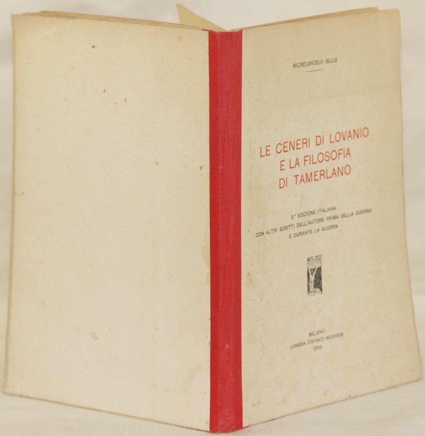 In 8. Dim. 25x17 cm. Pp. 85. Edizione del 1916 di questa opera sulla prima guerra mondiale scritta da Michelangelo Billia. Tra gli argomenti trattati: A Rodolfo Euken, La guerra all'Austria non è inevitabile (1 marzo 1915), Noi facciamo la guerra alla Germania (giugno 1915), Austria troppo vil nemico (1 luglio 1915), Al Popolo Italiano ecc. In buone condizioni Copertina in mezza tela in buone condizioni generali con lievi usure ai margini e dorso. Legatura in buone condizioni. All'interno le pagine si presentano in ottime condizioni con rare fioriture. Edition of 1916 of this work about the first world war written by Michelangelo Billia. Between the issues treated: To Rodolfo Euken, War to Austria cannot be stopped (1 marzo 1915), We make war to Germany (giugno 1915), Austria (1 luglio 1915), To Italian People ecc. In good conditions. Half cloth cover in good general conditions slightly worn in the edges and spine. Binding in good conditions. Inside pages are in very good conditions with occasional foxings.
