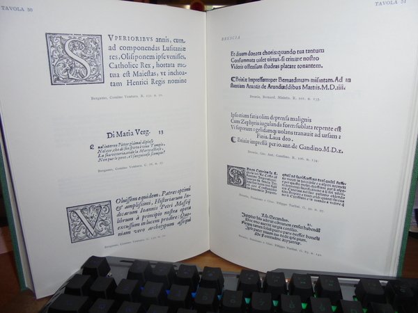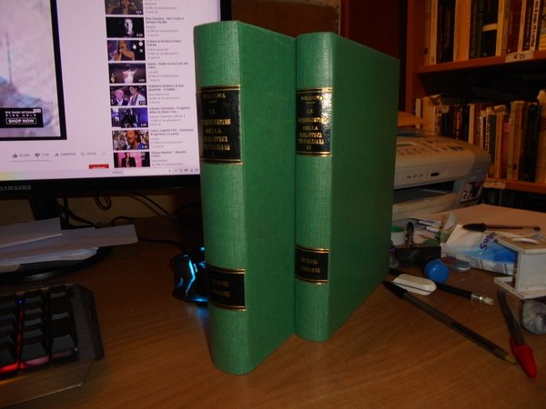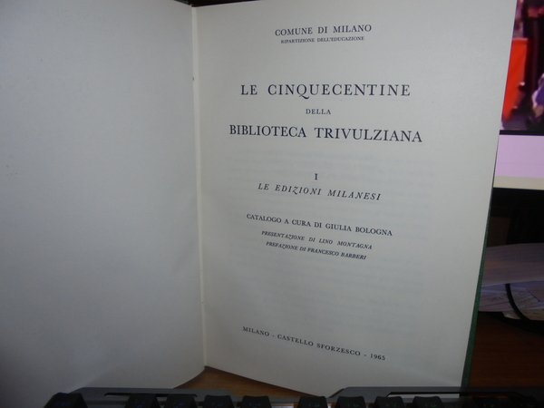 A cura di Giulia Bologna. Milano, Castello Sforzesco, 1965 - 1966. LE CINQUECENTINE DELLA BIBLIOTECA TRIVULZIANA le edizioni milanesi e le edizioni lombarde. 2 volumi in-8°, tela verde con titoli in oro entro tasselli ai dorsi, copertine originali conservate. Edizioni milanesi; xxii, (2), 233 pp. con 62 tavole fuori testo, in fine esempi di caratteri dei tipografi presenti nel catalogo, 13 pp.; Edizioni lombarde; xxii, 199 pp. con 68 tavole fuori testo. Perfetti esemplari con le copertine originali conservate. Uff. E - I - 4