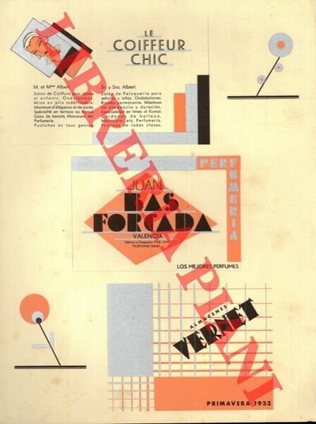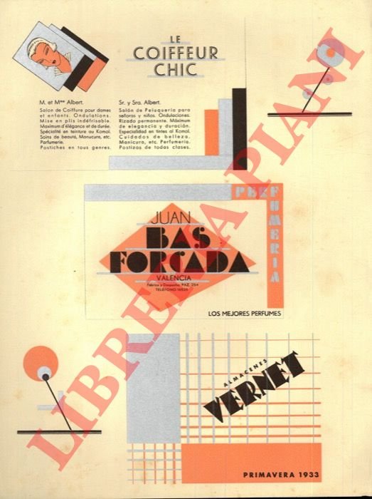 Valencia, 1933, cm. 31 x 24 bellissimo cartoncino pubblicitario, a clori e argento, alta grafica.