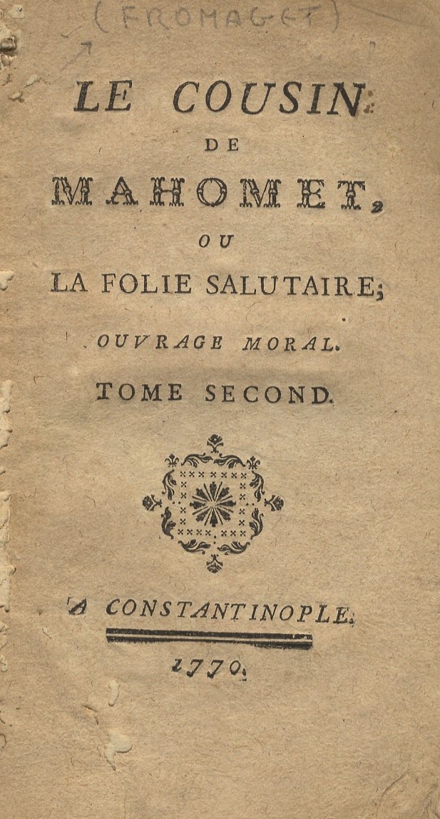 A Constantinople [ma: Paris], [s.n.t.], 1770, in-12, modesta brossura muta coeva priva del dorso e con mancanze alle coperte, pp. 247, [1]. Con doppio frontespizio (uno calcografico) e 3 tavole incise in rame f.t. Per il nome dell'autore e il luogo di pubblicazione cfr. Barbier, v. I, p. 244, n. 3160. Manca il primo volume. Lievi mancanze marginali dovute a tarlo.