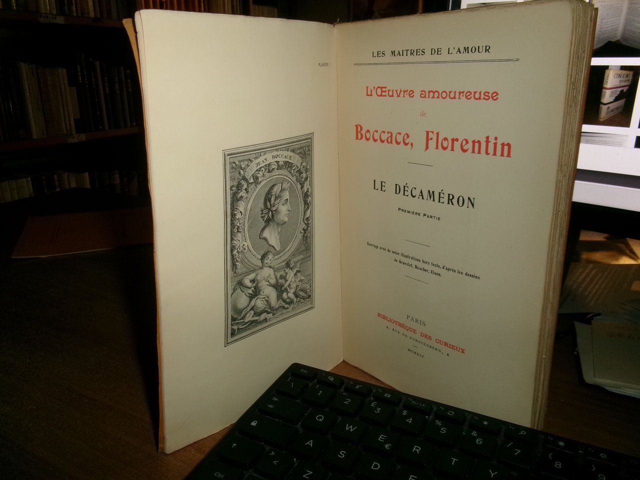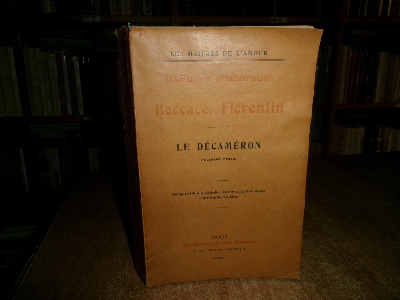 BOCCACCE, FLORENTIN. Paris, Biblioteque des Curieux, MCMXIV (1914). Les Maitres de L' Amour. L' Oeuvre Amoureuse. Le Décaméron Premier Partie. orné de seize illustrations hors texte, d' après les dessins de Gravelot, Boucher, Eisen. In-8°, br. orig. 388, (4) pp. con CVI tavole fuori testo. Esemplare i buono stato di conservazione con testo in francese. Neg. storia 2 entro busta trasp.